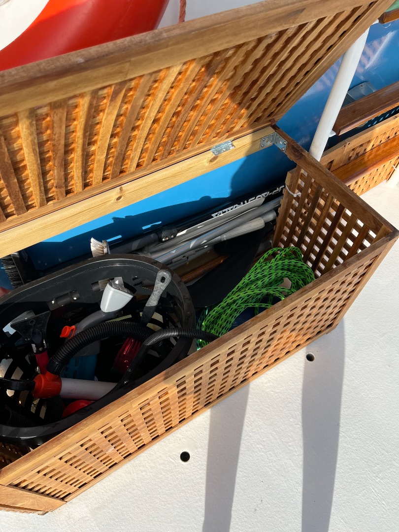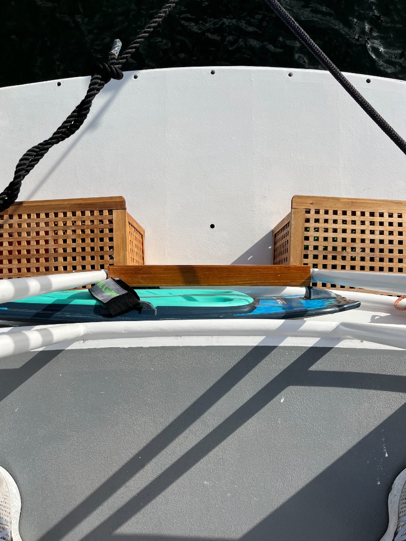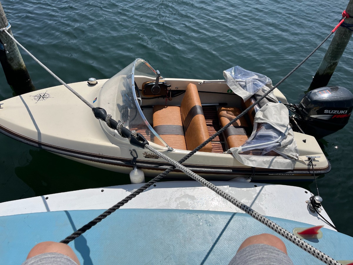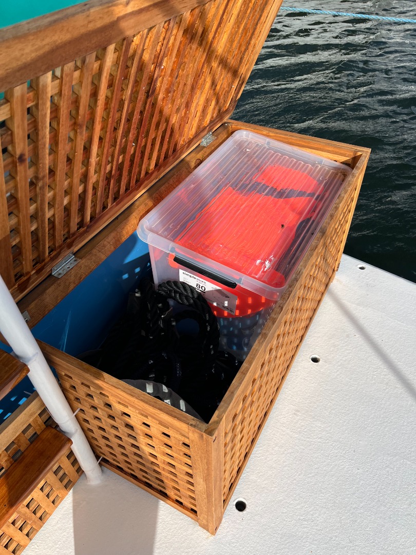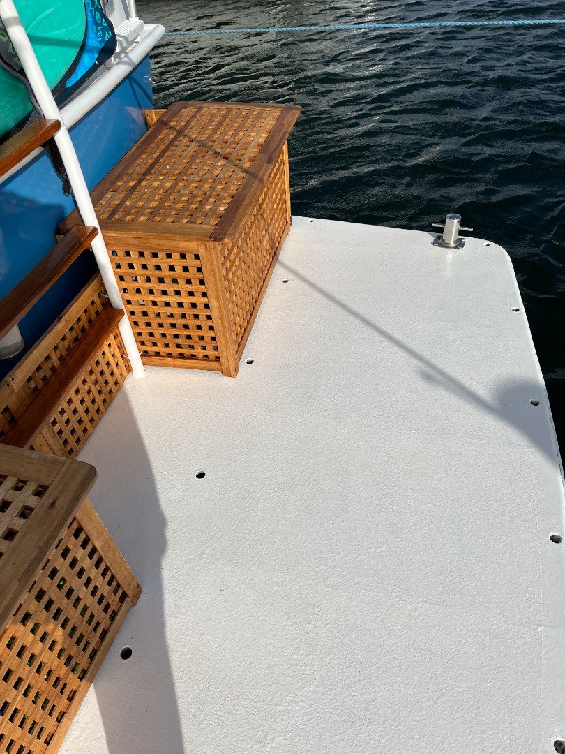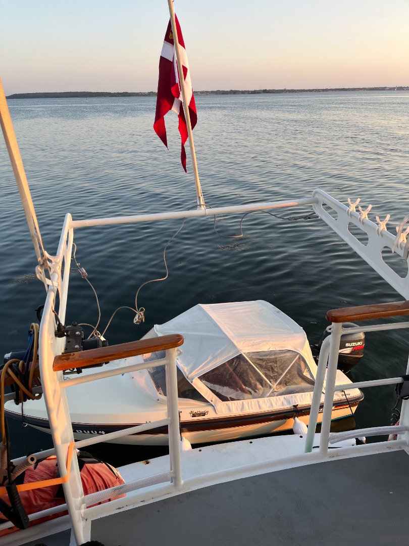 Badeplatform, kæmpe platform på 5kvm med ekstra plads og to bænke med opbevaringsplads til årer, redningsveste, tovværk. bådens solterrasse. Et perfekt solspot både på havet og i havnen.