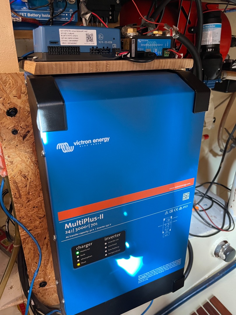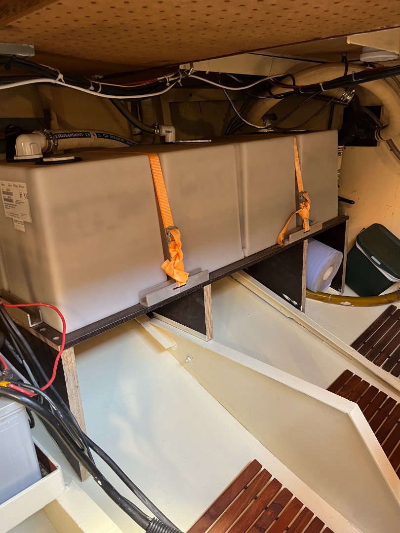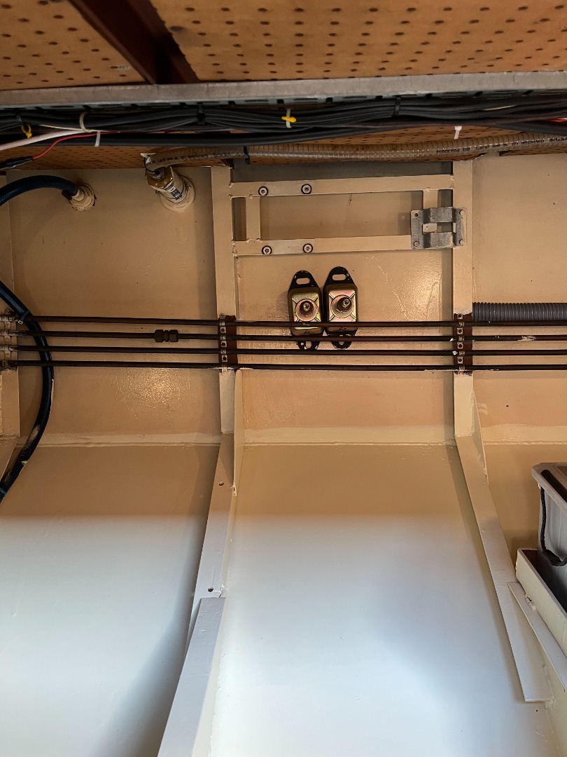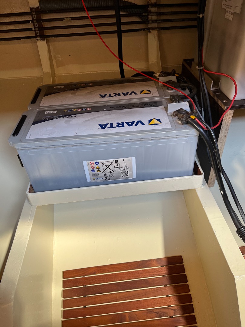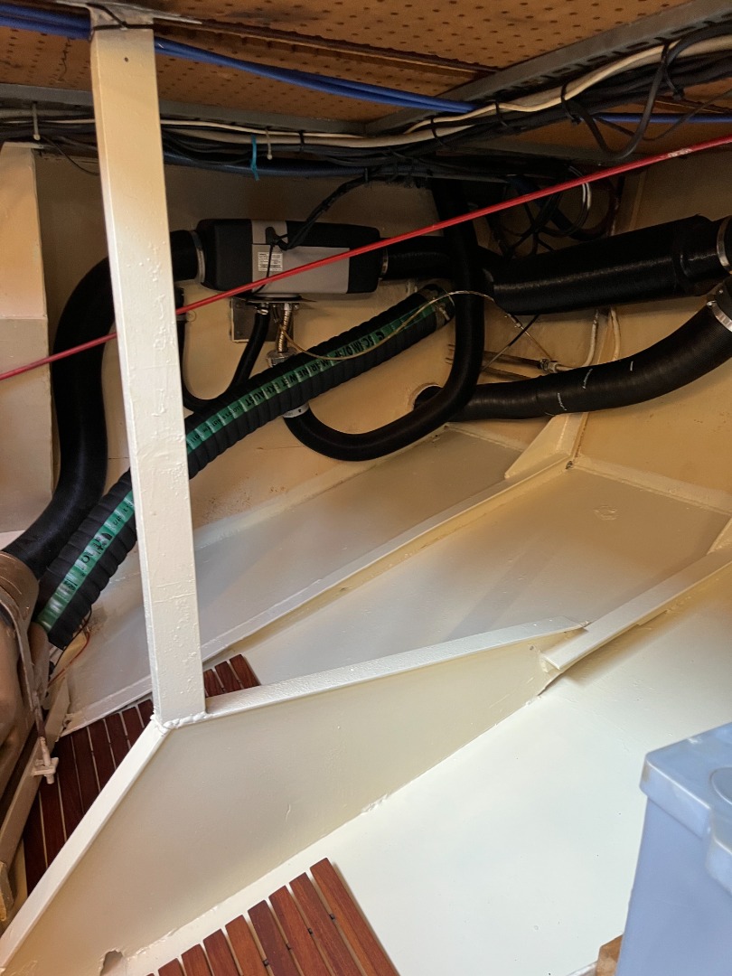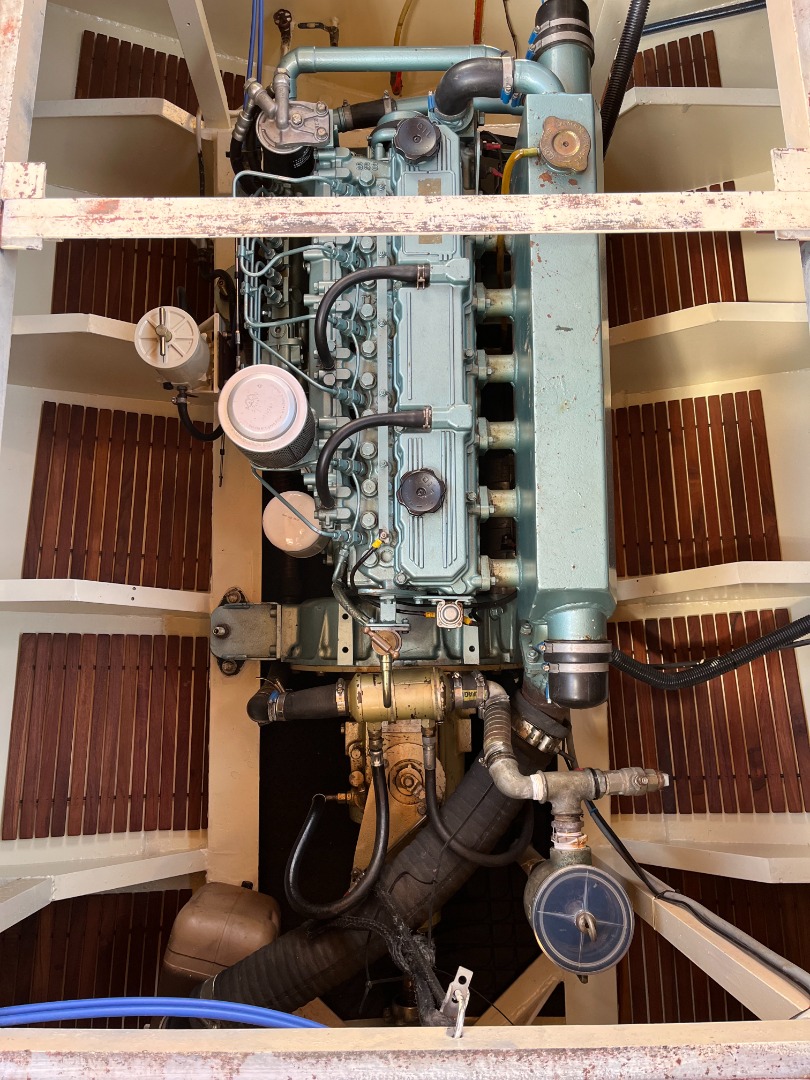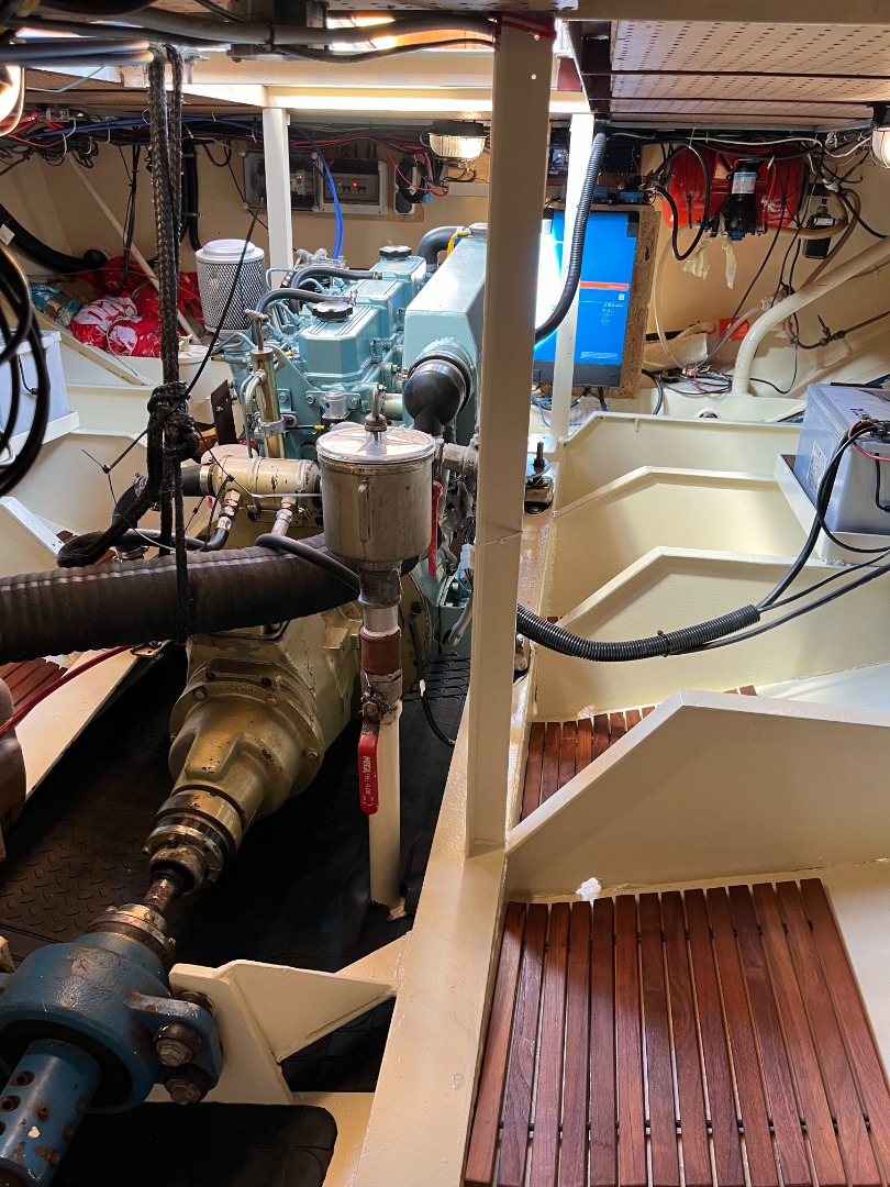 Motorrum, Velholdt, rent og overskueligt motorrum. Med adgang til motor, aksel, batteripakker, Charger/inverter, holding tank, vandsystem og varmefyr.
