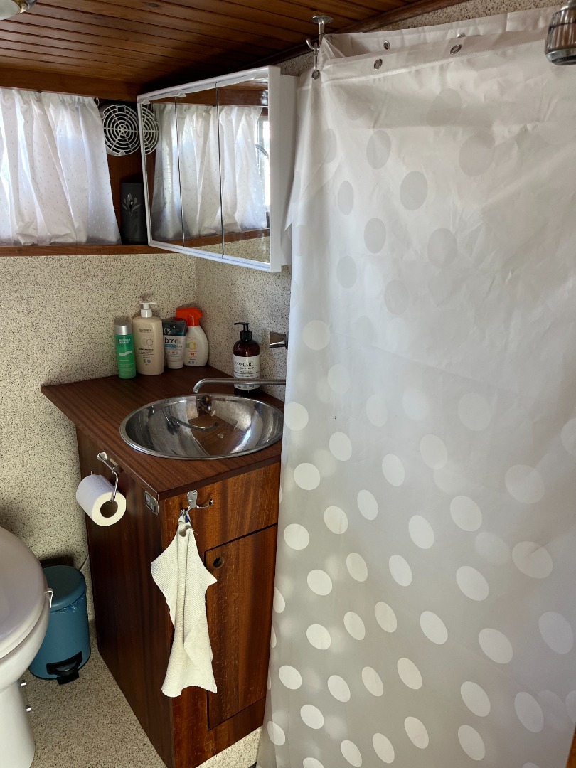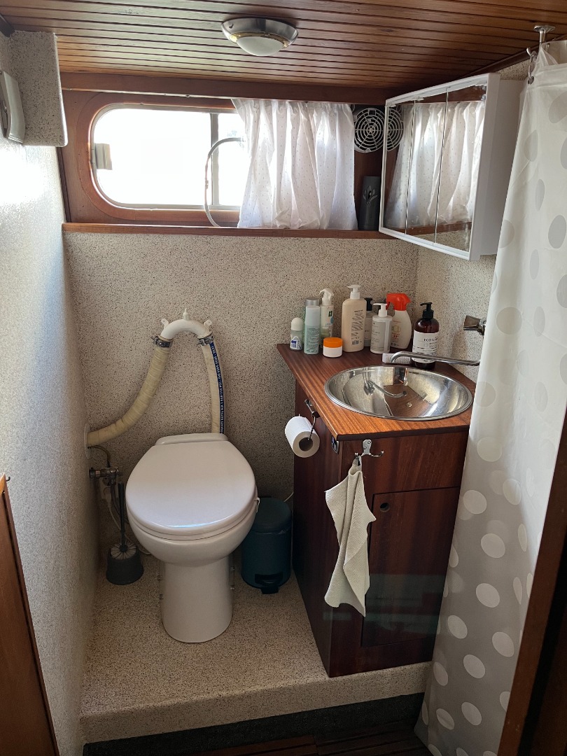 Toilet og bad, i venstre side, ned af trappen fra salonen. Nyt elektrisk toilet, håndvask med koldt og varmt vand. Bruser med gulvafløb.